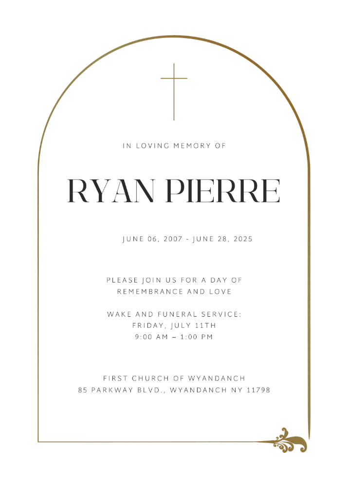 Ryan Nicholas Pierre passed away on June 28, 2025, leaving behind his parents, Nirva and Techler Pierre, loving family and friends. Born in Manhasset, NY, he resided in Manorville, NY, and attended high school there. A visitation will be held on Friday, July 11, 2025 from 10am to 12pm at the First Church of Wyandanch Ministries located at 85 Parkway Blvd, Wyandanch, NY. Following the visitation, burial will take place at Amityville Cemetery in Amityville, NY at 2pm.